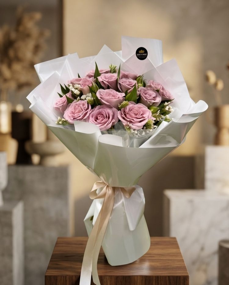 A stunning arrangement of soft lilac roses, elegantly wrapped in crisp white paper and finished with a satin ribbon bow. This bouquet embodies sophistication and serenity, making it a perfect gift for anniversaries, birthdays, or heartfelt moments. The gentle lavender hue symbolizes admiration, enchantment, and lasting affection — ideal for expressing feelings with timeless grace. Presented with care and artistry, this bouquet brings beauty and elegance to any occasion.