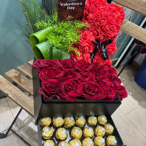 Luxury Valentine Love Box - Red Rose Teddy, Fresh Roses & Ferrero Rocher Drawer