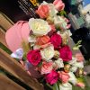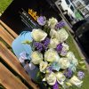 This adorable newborn gift features fresh white roses, soft purple lisianthus, and delicate lilac blooms arranged in a charming light blue bucket-shaped vase, topped with a sweet satin bow.