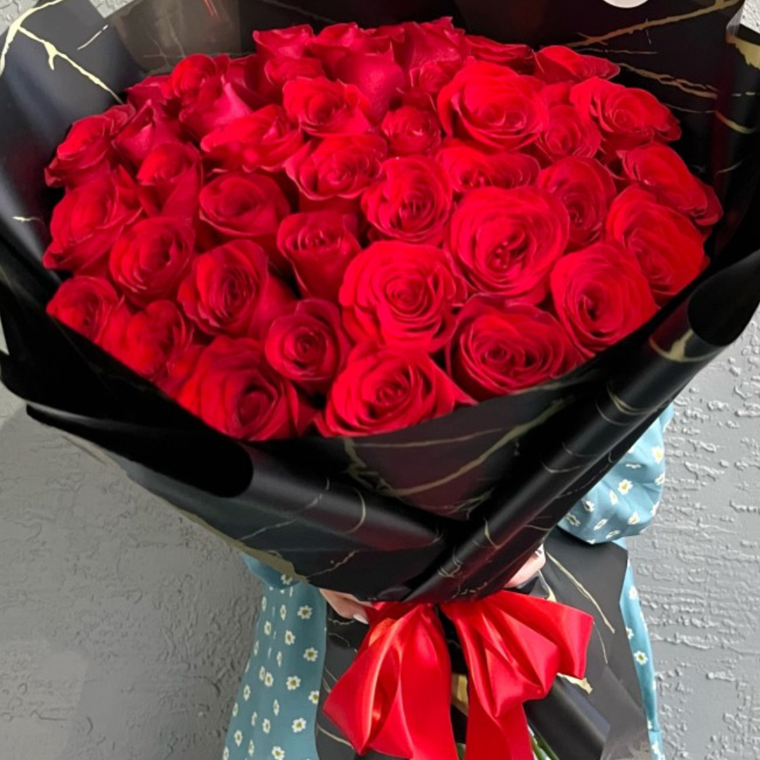 Bouquet de fleur de 50 rose rouge bien emballée en noir