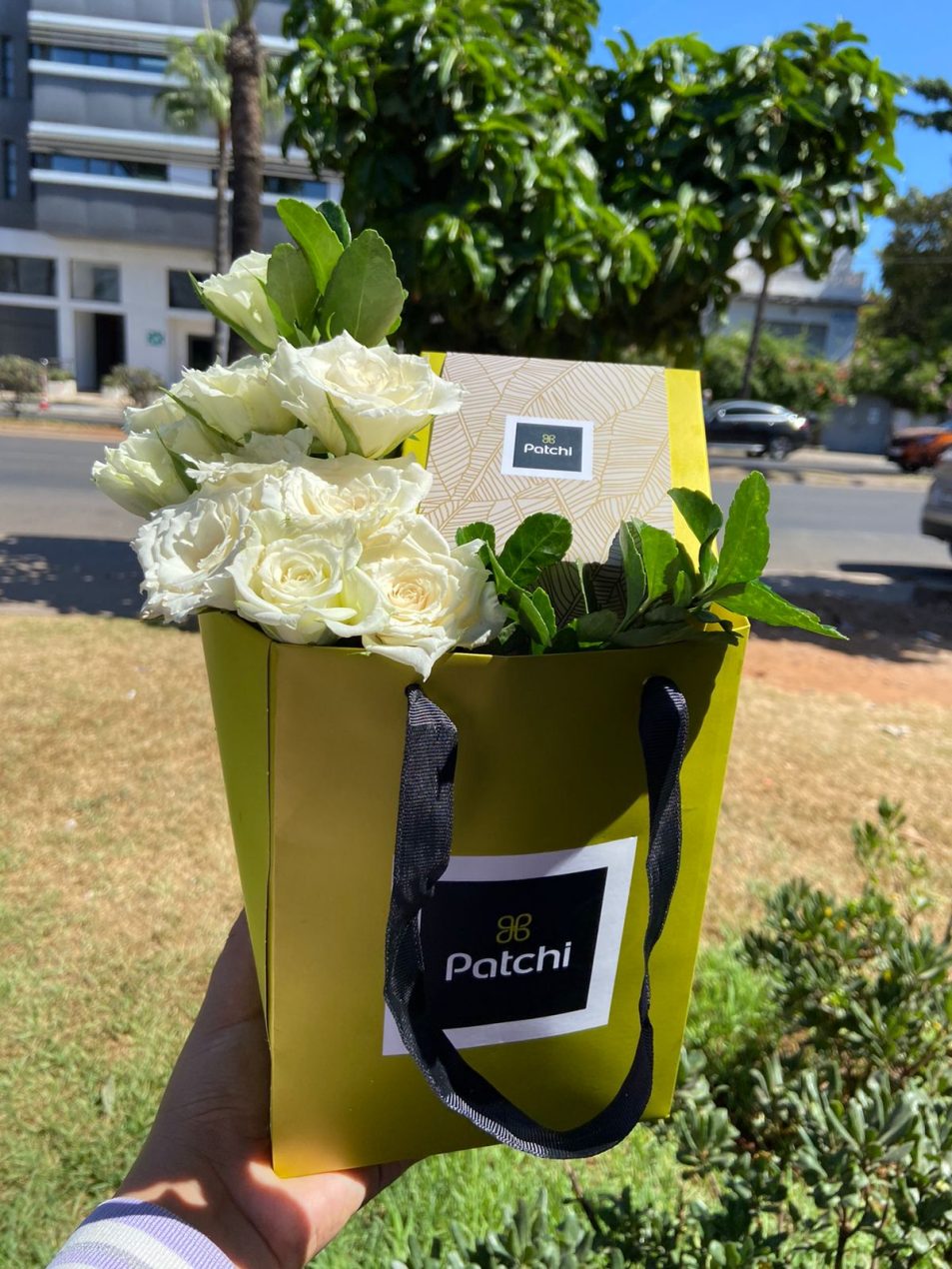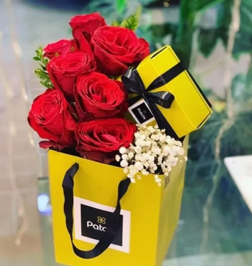 Boite chocolat PATCHI bien emballée avec des fleurs rouge