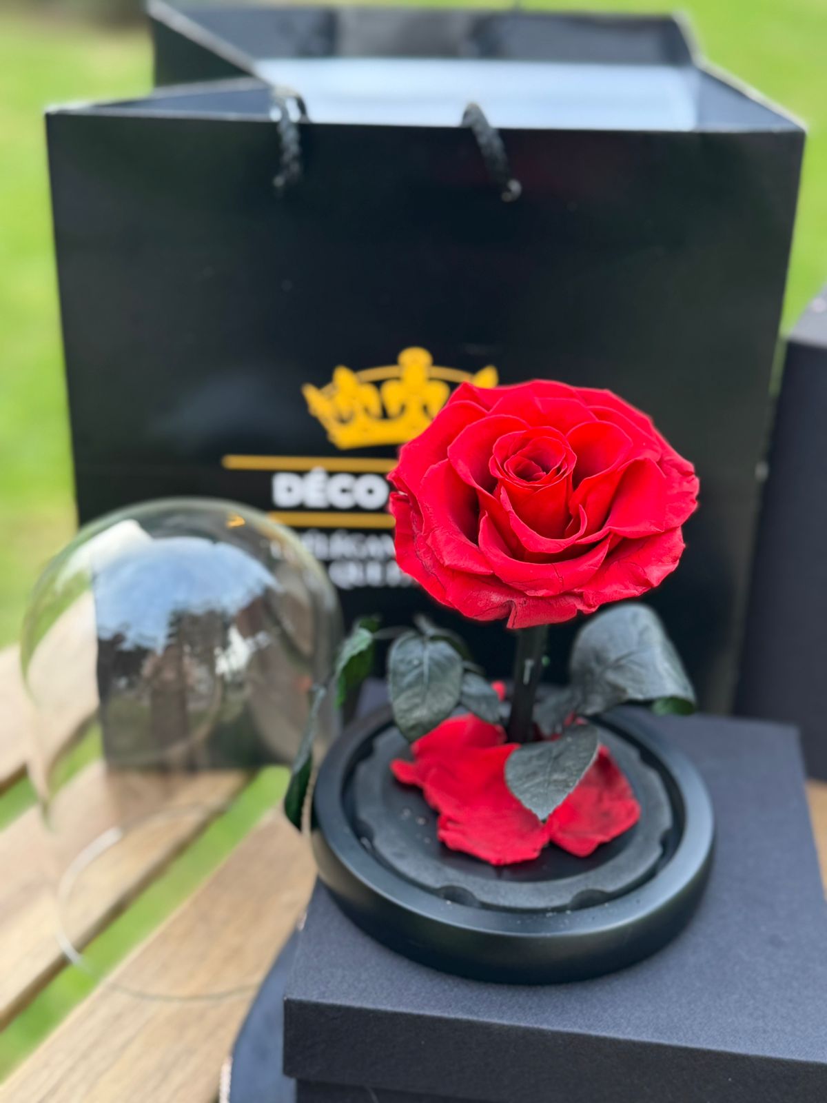 Cloche en verre élégante renfermant une rose éternelle rouge au cœur de son socle noir, symbole d’amour intense et de passion.