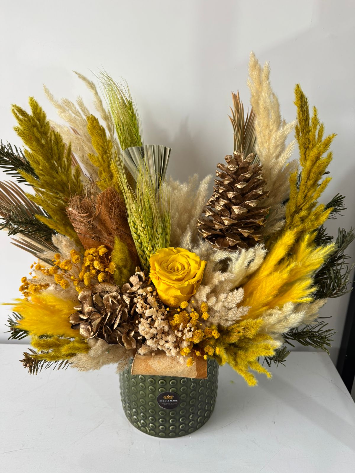 composition de fleurs séchées et rose éternelle Jaune taille L dans un support élégant de couleur vert olive en céramique